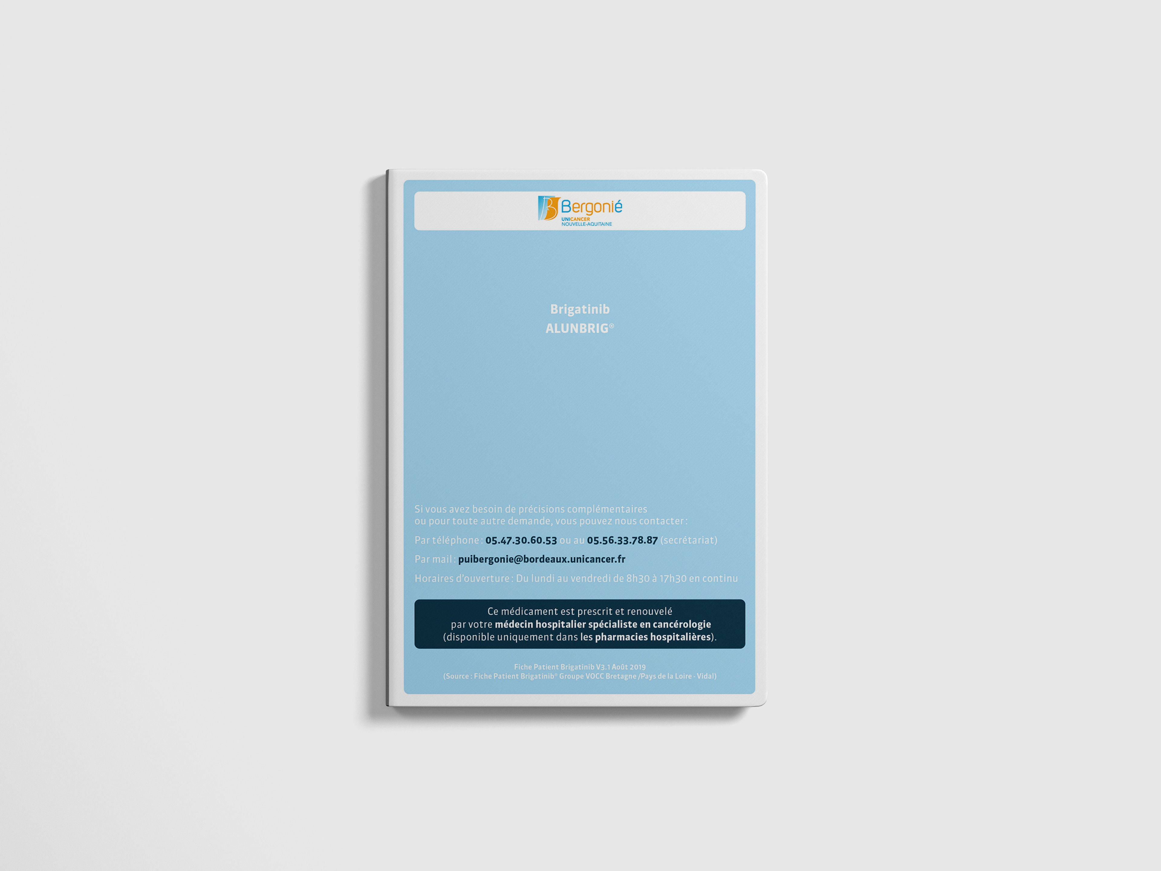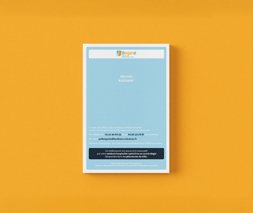 L’Institut Bergonié est le Centre régional de Lutte Contre le Cancer (CLCC) de la Nouvelle-Aquitaine. Depuis plus de 90 ans, il contribue au progrès médical et au rayonnement international de la recherche en matière de prévention, de dépistage et de traitement du cancer, une maladie chronique devenue deuxième cause de décès dans le monde. La création d’un livret et de fiche pour le suivi des patients est plus qu’important. En effet l’illustration apporte une meilleure compréhension des informations importantes à la prise de médicament dans certaine prise en charge.